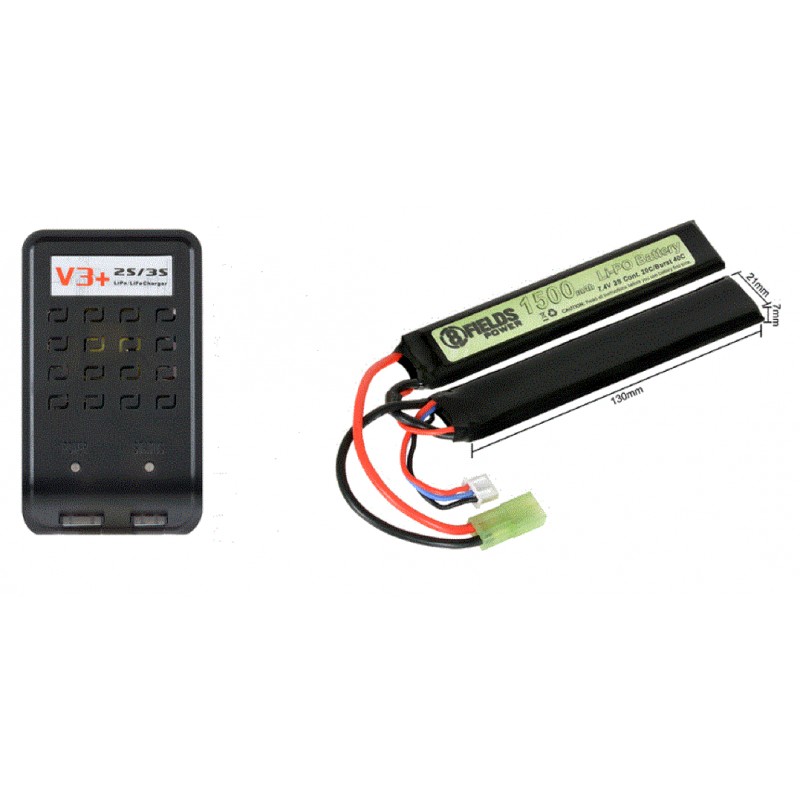 This combo pack contains a 7.4v lippo battery and smart charger. The nunchuck configuration battery fits most airsoft rifles, and the smart charger will quickly charge and keep the battery topped off, small type tamiya plugs that are common to most airsoft rifles as well.
