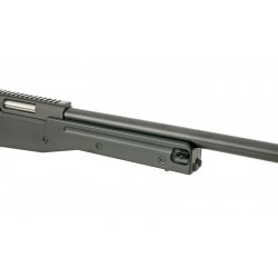 This airsoft sniper rifle is spring-powered, requiring manual reloading (spring tension) before each shot, which is typical for spring-powered replicas. Weighing around 3.8 kg, this impressive replica is well-balanced and comfortable for extended use, thanks to its Thumbhole grip design characteristic of the AWM rifles. The adjustable stock further enhances flexibility, allowing smooth customization to the shooter's preferences, including adjusting the length and height of the cheek rest. The MB01AE features a 23.5-inch aluminum barrel and a 22 mm Picatinny rail on the receiver, enabling the mounting of various optics. For added authenticity, a clear serial number is precisely engraved on the receiver. Made from reinforced polymer, the stock mimics the material used in the real counterpart. It includes mounts for a slings and a bipod.