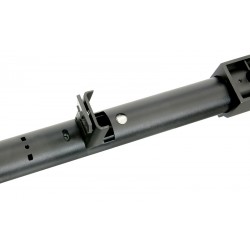 The replica is equipped with a stainless steel cylinder, a matching cylinder head, a 90° aluminum piston with a seal cup head, and stainless steel components in the trigger mechanism. A standard APS2 spring (9 mm diameter) and a 9 mm steel L96 spring guide are also used. All this is complemented by a 90° trigger assembly with an entirely new trigger type and steel components designed to resist premature wear. These elements allow the replica to use M220 springs, delivering a power output exceeding 650 FPS. For convenience, the cylinder assembly can be disassembled without dismantling the entire replica; simply lower the cylinder lock located in the trigger hole.